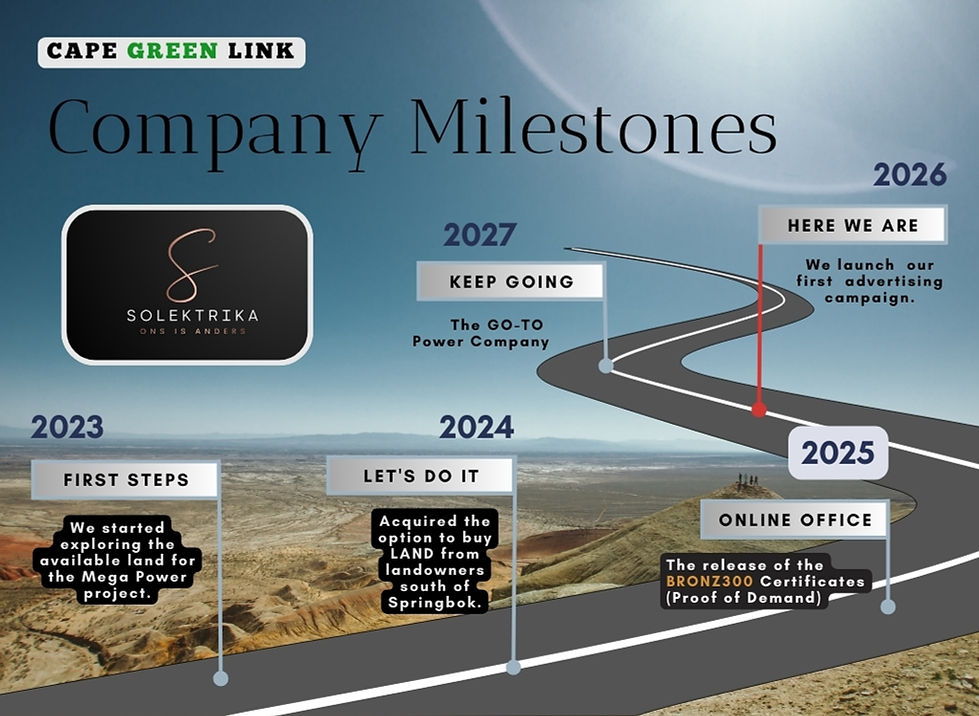 Answer: The Cape Green Link™ is the only power alternative - driving economic growth with sustainable, affordable green power in 2030. Solektrika provides affordable and reliable electricity to Bronz300 certificate holders - this is your best path to energy independence".